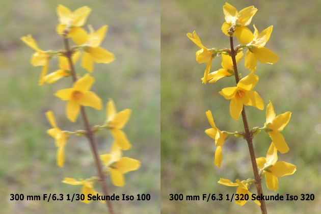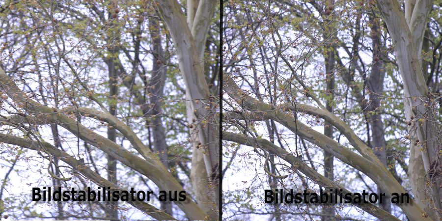 Was er nicht kann, ist die sogenannte Bewegungsunschärfe ausgleichen, die von sich selbst bewegende, schwingende oder vibrierende Objekte ausgeht. Dies funktioniert nach wie vor nur über eine entsprechend selbstgewählte kurze Verschlusszeit, diese erreicht man über die Anpassung der Blende. Hat man bereits die größte Blendenöffnung gewählt da das Objektiv nicht über die ausreichende Lichtstärke verfügt, bleibt einem nur noch die Möglichkeit die ISO nach oben zu nehmen. Aber auch dabei muss man beachten, je höher man die ISO einstellt umso grobkörniger wird das Bild, was dann wiederum zu einem detaillosem Bild führt. Am zweiten Beispielbild könnt ihr sehen, wie ich den im Wind schwingenden Zweig einmal mit ISO 100 und Verschlusszeit 1/30 das andere Mal mit ISO 320 und Verschlusszeit 1/320 fotografiert habe. Da bei beiden Aufnahmen in Brennweite 300 mm die größtmögliche Blendenöffnung F6.3 war, konnte ich dies nur noch über die ISO korrigieren, um zu einem schärferen zweiten Bild zu kommen. Aber auch bei diesen Aufnahmen war der Bildstabilisator an. Da ich voll aufgezoomt hatte und der Zweig sich in 3 Metern Entfernung befand.